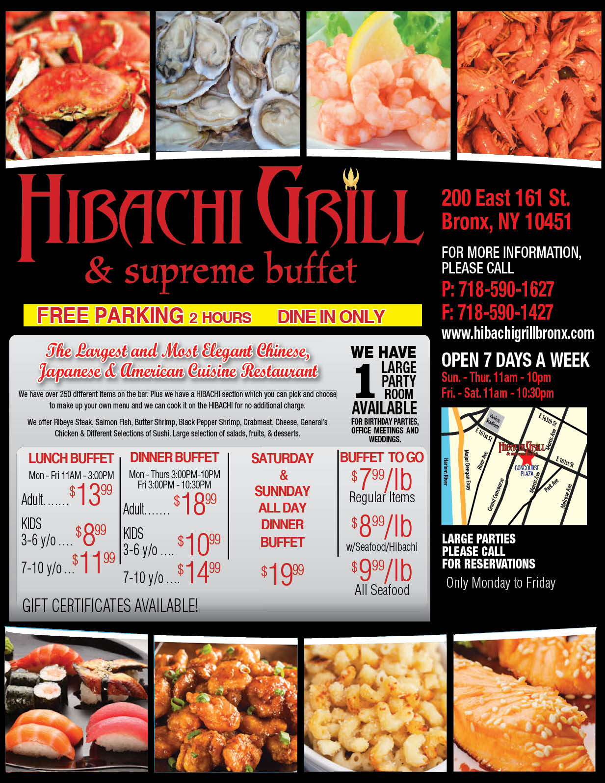 Hibachi Grill & Supreme Buffet have over 250 different items on the bar. Plus we have a HIBACHI section which you can pick and choose to make up your own menu and we can cook it on the HIBACHI for no additional charge.
